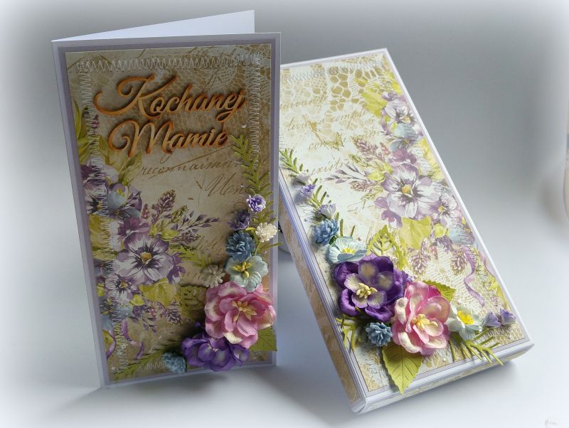 Uwielbiam fioletowy. Lubię go najbardziej w połączeniach z kontrastującym kolorem, np. musztardowym, zielenią lub jak w tym przypadku - brązem. Papiery są tak bogate w kwiatową grafikę, że nie chciałam już dokładać zbyt wielu kwiatów i innych ozdób.