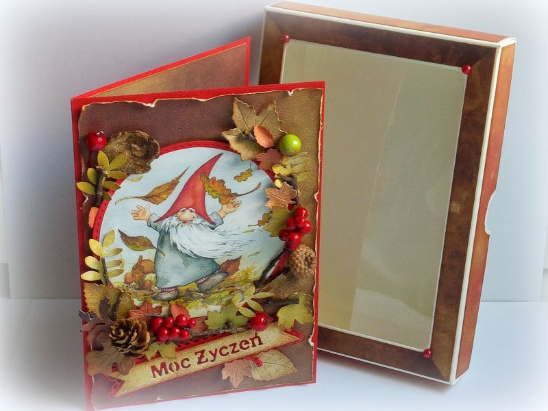 Tę grafikę z krasnalem kupiłam już dość dawno, bo mnie urzekła mocno, jednak jakoś nie było okazji jej wykorzystać. Teraz jednak mamy wrześniowe wyzwanie w Szufladzie pt."las" no i tutaj ten leśny skrzat pasował mi już doskonale. Do jesiennych brązów dołożyłam żywą czerwień, nawiązując do krasnalowej czapki. Papiery z Galerii Papieru.