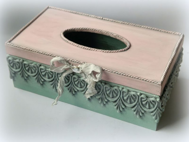 Jak tylko zobaczyłam tą serwetkę, wiedziałam jaki chcę zrobić chustecznik. Czasem tak jest - pomysł wpada do głowy sam i wszystko co trzeba zrobić, to go zrealizować :) Tak było w tym przypadku. Wiedziałam, że muszę wykorzystać dużo czarnej farby, brzegi potraktować na złoto, podobnie jak wyciski z foremek. Złoto jest jednak stare, antyczne.