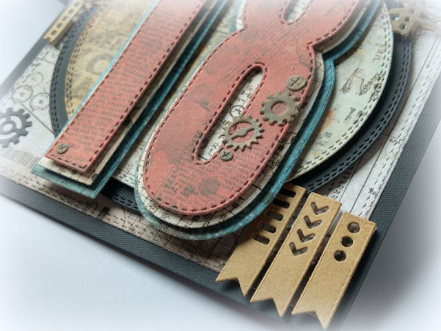 Druga karteczka dla równowagi - jest męska - z trybikami i papierem "konstrukcyjnym". Tutaj użyłam papierów Stamperii.